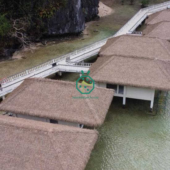 Pour la décoration des toits de chaume des bungalows sur pilotis, tuiles de chaume en nylon Les tuiles de chaume en nylon sont des solutions très économiques. Grâce à leur structure chimique, elles sont extrêmement résistantes et conviennent parfaitement aux zones côtières. L'aspect duveteux des toitures de bungalows en chaume de nylon attirera sans aucun doute l'attention de vos clients et les incitera à séjourner dans votre hôtel. De plus, les panneaux de chaume en nylon sont plus sûrs que les matériaux de toiture en chaume naturel, car ils atteignent le niveau V0 pour la plupart des indices de la norme d'essai de résistance au feu UL 94-2013. Compte tenu de ces avantages, les toitures de bungalows en chaume de nylon constituent une solution économique pour la conception de ces derniers.