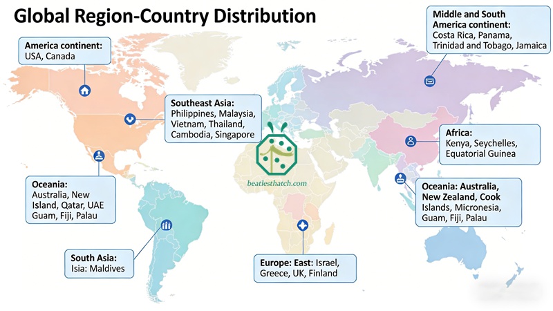 Australie, Nouvelle-Zélande, Îles Cook, Micronésie, Guam, Fidji, Palaos, Vanuatu