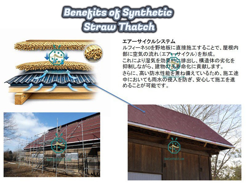 Notre distributeur agréé au Japon a mené à bien un projet de restauration du patrimoine dans la préfecture de Yamagata, remplaçant les toitures de chaume naturel abîmées et tombées des bâtiments traditionnels par nos produits haut de gamme. tuiles de toit en paille synthétique .